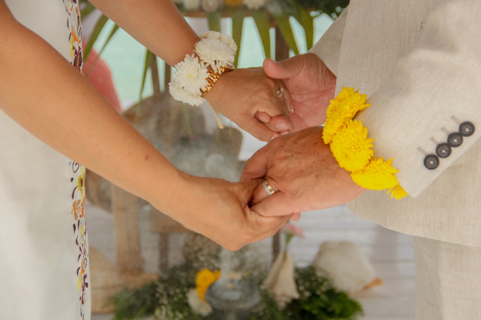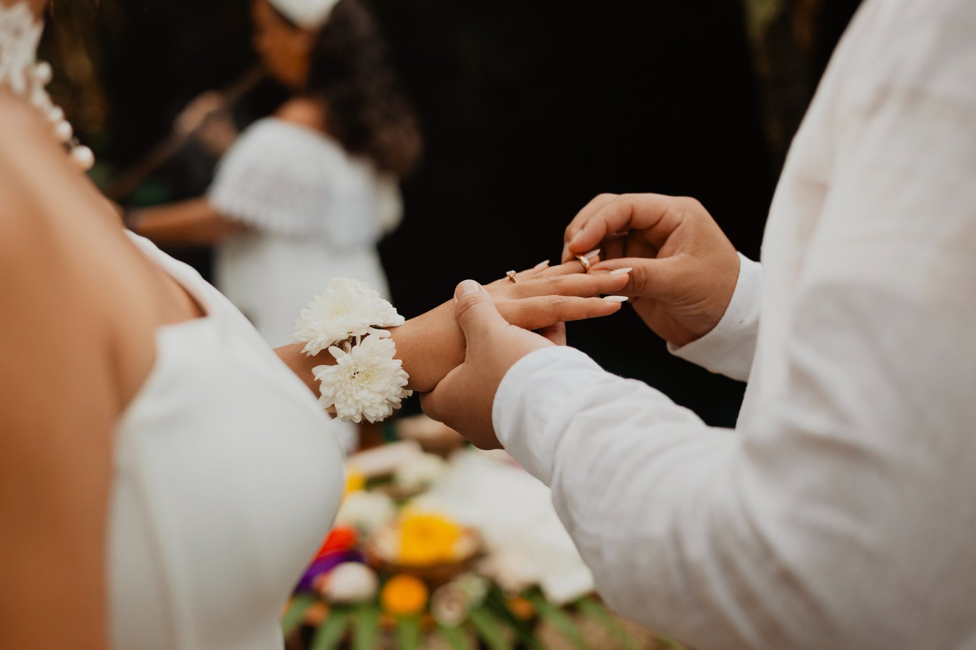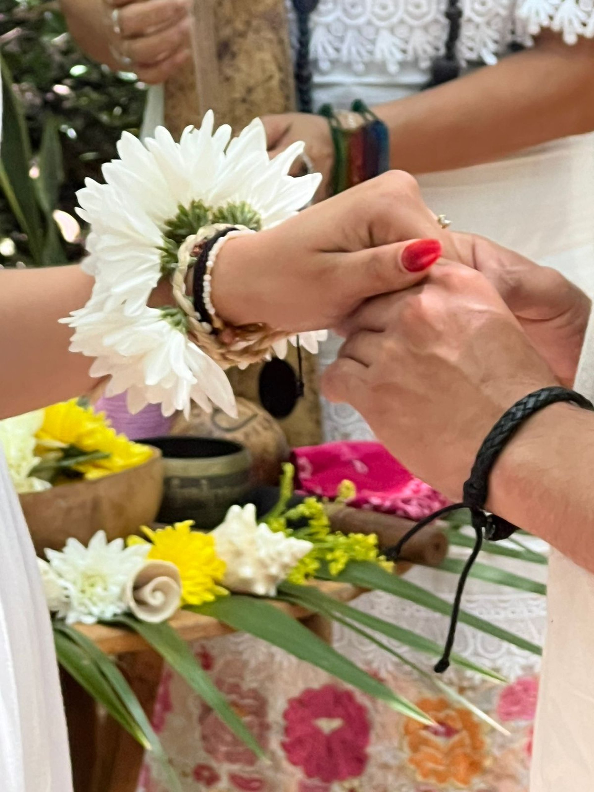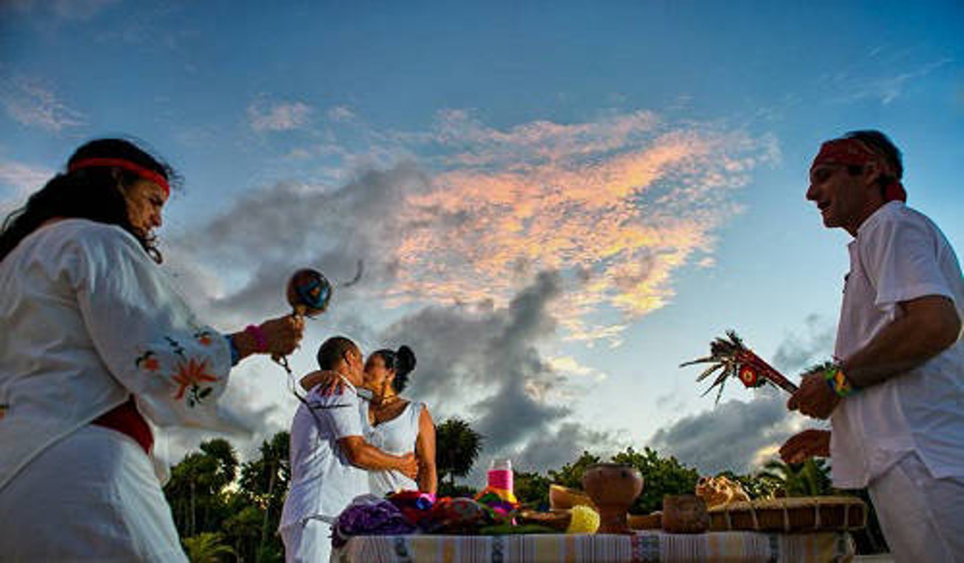 En presencia de los Seres Superiores se les declara unidos como esposo y esposa, y se les bendice con pétalos de flores.